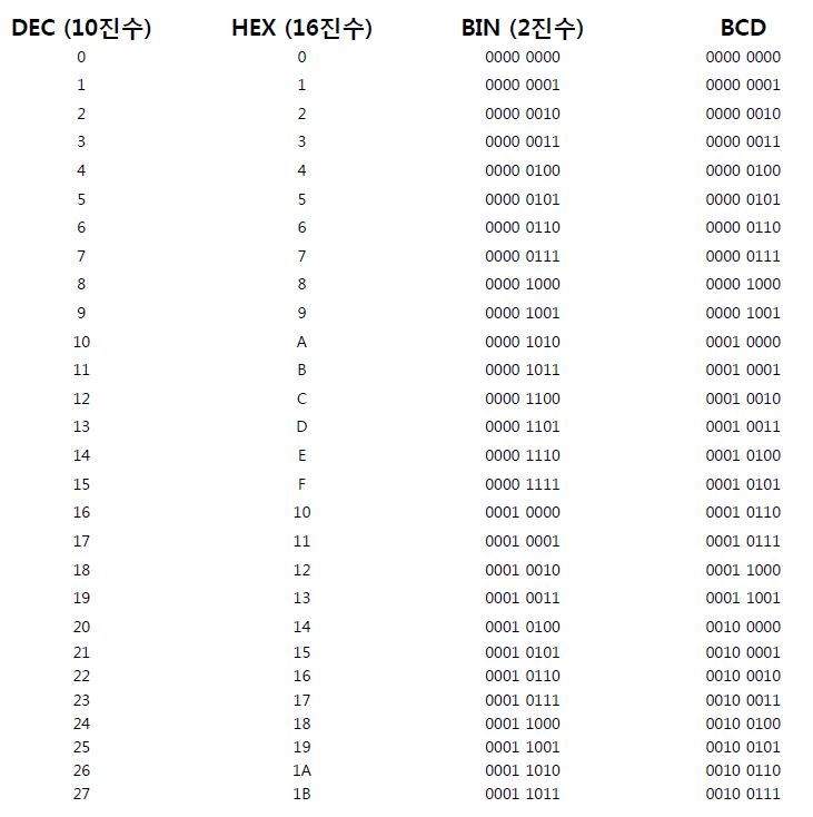 10진수 0부터 27까지를 1Byte 2진수로 표현한 것을 잘 보십시오.