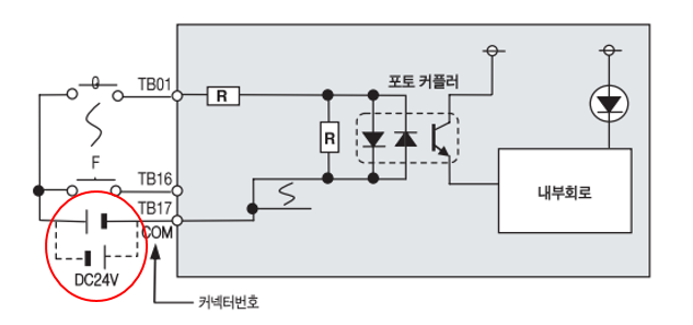 위 도면에서 빨간색 원으로 표시된 부분을 잘 보십시오. 저 부분이 의미하는 것은 COM단자인 TB17번에 DC24V의 플러스를 연결해도 되고 마이너스를 연결해도 된다는 의미입니다. 그건 포토커플러 부분이 양방향 모두를 지원하기 때문이죠. 만약에 PLC가 싱크타입이라면 COM단자에 플러스를 연결해야하고, 소스타입이라면 COM단자에 마이너스를 연결해야 합니다. 간단하죠?? 아 물론 이렇게 COM을 묶기도 하지만 안묶고 개별 포인트마다 각각 2단자를 사용하기도 합니다.