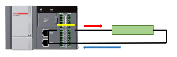 위 그림을 보면 굉장히 간단하지요? DI 접점의 회로를 간단히 표현하면 위와 같은 상황이 되는 겁니다. 설명을 하자면 PLC에 파란색 스위치가 하나 연결되어 있고, 파란색 스위치가 열려있을때는 빨간색 화살표 방향으로 출발한 전기가 노란색 화살표 방향으로 돌아오지 못합니다. 그런데 파란색 스위치가 닫히게 되면 빨간색 화살표방향으로 출발한 전기가 노란색 화살표 방향으로 돌아와서 PLC가 이 전기신호를 검출하게 되는 것입니다. 이게 DI Point의 내용입니다. 간단하죠?