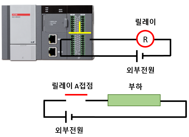 PLC는 릴레이를 살리고 우리는 릴레이를 스위치로 사용하여 부하에 전원을 ON/OFF 시켜주는 방식입니다. 이렇게 하면 부하나 외부 케이블에서 사고가 발생하여도 PLC까지 사고가 미치지 않고 릴레이가 한번 끊어줄 수 있습니다.