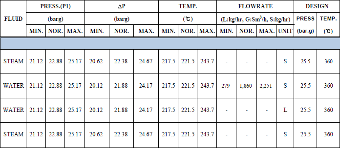 두번째로는 Operation Condition을 명시해 주어야 합니다. 각 MOV가 설치되는 포인트의 정보를 한눈에 알아 볼 수 있어야 합니다. 해당 포인트의 정보는 Heat & Mass Balance를 따라가야 합니다. 설계 초기단계에서는 Heat & Mass Balance가 변경될 요소도 많기 때문에 꼭 중간중간 자주 크로스체크를 해야 합니다. 조금이라도 의구심이 들때는 공정파트와 협의 또는 확인을 해야 합니다. 해당 정보에 따라 재질이 다양히 바뀌기 때문에 실수해서는 안됩니다.