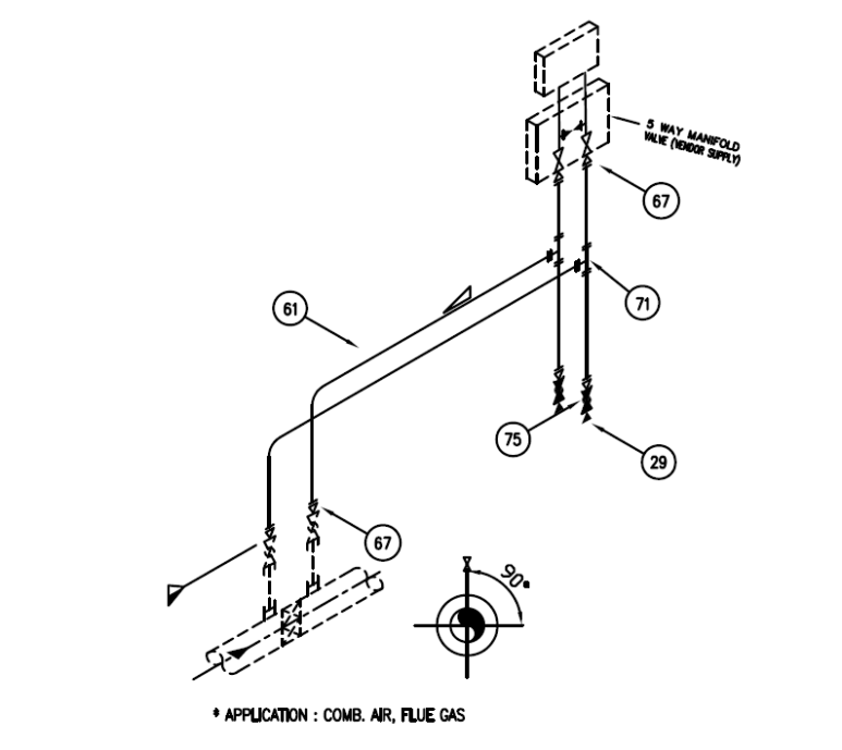먼저 차압식 유량계의 훅업도면에 대해서 알아보겠습니다. 어제 알아보았던 Pressure Transmitter의 훅업도면과 거의 유사합니다. 다만 차압이다보니 Pressure Impulse Point가 두 곳인것이 다르네요. 그리고 유체가 Combusion Gas, Air Flue Gas등의 기체이기 때문에 Impulse Point는 배관의 수직방향입니다. 그리고 응축수가 생길 것을 대비해서 드레인 포인트도 만들어 두어야 합니다.