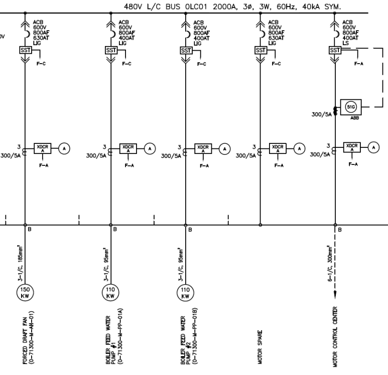 분기되어 배전될 때도 모두 ACB를 사용하였습니다. 만약에 MCCB를 사용했다면 우리는 과전류 차단을 위해 EOCR과 MC를 조합하여 MCCB와 같이 사용을 했어야 했을 겁니다. 하지만 요즘은 ACB 하나로 고장전류와 과전류를 한꺼번에 차단하는 추세입니다. ACB가 자리를 많이 차지하긴 하지만 그만큼 더 신뢰성이 높고 안전하기 때문입니다. 제일 오른쪽 마지막에 보면 MCC(Motor Control Center)로 가는 Feeder가 보입니다. 거기는 단독 부하가 아니기 때문에 특별히 51G계전기가 추가로 달려있는것을 확인 할 수 있습니다.
