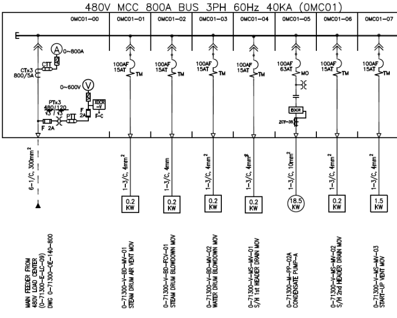 51G 계전기는 Ground sensor relay로 MCC로 넘어간 전원들의 접지상태 등 지락, 누전등의 상태를 감시합니다. 그럼 이제 MCC 판넬의 Single Line도 한번 보겠습니다.