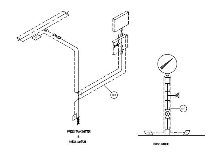 그리고 실제 P&ID도면상으로 Electric Heat Tracing을 표현한다면 위와 같이 표현됩니다. 참고하세요. 그리고 위와 같은 기계배관에만 Heat Tracing을 하지는 않습니다. 계장 도압관 (Impulse Line)과 계기들에게도 필요한 경우 Heat Tracing을 합니다. 그럴 경우 아래와 같이 표현하여 줍니다.