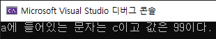 변수 a에 문자 c를 대입하였습니다. 여기서 중요한 것은 문자 c에 작은 따옴표를 사용하였다는 부분입니다. 만약에 작은 따옴표를 사용하지 않았다면 프로그램에서는 c를 문자로 보지않고 변수로 봅니다. 그러면 에러가 발생하겠죠? 그렇기 때문에 꼭 작은 따옴표를 사용하여야 합니다. 그리고