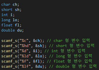 scanf_s함수에 대한 사용은 이미 이전시간에 알아보았습니다. 문자를 입력해야 하기 때문에 %c를 사용했다는 부분만 기억하면 됩니다. 참고로 각각의 자료형 변수에 대한 입력 형태는 아래와 같습니다.
