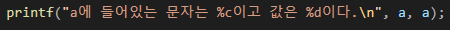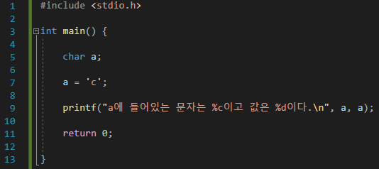 a라는 변수 명을 가진 char변수를 하나 선언하였고,