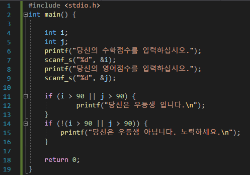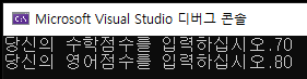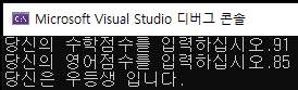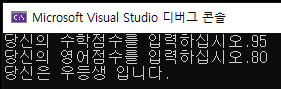 수학점수와 영어점수가 둘다 90점을 넘지 못하였을때는 프로그램이 그냥 종료되었고, 두 과목 중 하나라도 90점을 넘을 때는 "당신은 우등생 입니다."라는 문구가 출력되는 것을 확인 할 수 있었습니다.