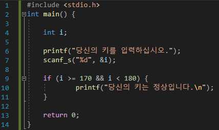 위 예제를 풀이해 보자면 키를 입력받고 입력받은 키가 170이상이고, 180미만이면 "당신의 키는 정상입니다."라는 문구가 출력되는 프로그램입니다. 여기서는 if문을 사용하여 조건을 만들었는데 170이상과 180미만을 동시에 표현하기 힘들어서 if문을 중복으로 작성하여 조건문을 완성하였습니다. 이 프로그램을 좀 더 간결하게 만들 수는 없을까요? 물론 가능합니다. 아래 예제를 확인해 주세요.