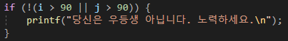 위에서 보았듯이 if문의 조건식에서 소괄호를 하나 더 추가하고 논리 부정 연산자 심볼인 !를 넣어주면 됩니다. 어려운것은 없죠? 그럼 기존의 논리 합 연산자일때와 논리 부정 연산자가 추가되었을때의 차이는 무엇일까요? 논리 합 연산자만 있는 조건식은 아까 확인했던것과 같이 수학점수나 영어점수 중 한 과목이라도 90점을 넘으면 조건이 1(참)이 되어 우등생이라는 문장이 출력되었습니다. 논리 부정 연산자가 추가되면 정확하게 반대로 생각하시면 됩니다. 수학점수와 영어점수 모두 90점을 넘지 못할 경우 조건식이 1(참)이 된다고 생각하시면 됩니다. 그럼 실행하여 결과를 확인해 볼까요?