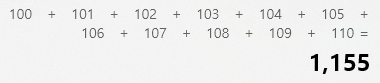 100부터 110까지 더하여 보니 1155가 나왔네요. 처음보는 수를 더하다 보니 맞는지 헷갈립니다. 그래서 윈도우 계산기를 통해 직접 더하여 보았습니다.