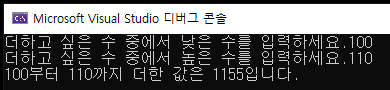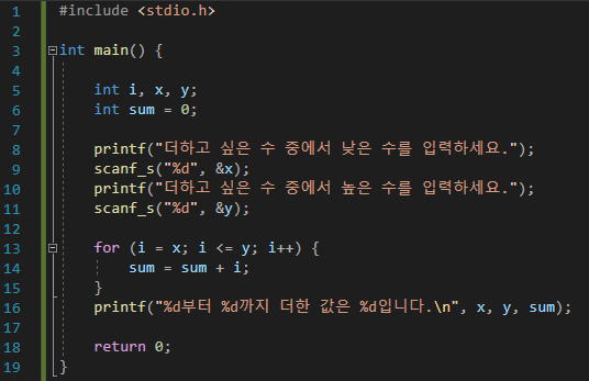 위에서는 1부터 10까지라고 지정되어 있는 값을 더하는 프로그램이었다면 이번에는 매번 다른 숫자들을 지정하여 그 숫자들 사이의 값들을 모두 더하는 프로그램을 작성해 보겠습니다. 아래 내용을 보시기 전에 미리 한번 직접 작성해 보시는 것을 추천드립니다.
