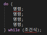 do while문의 형식은 위와 같습니다. do와 실행될 명령이 앞에 오고나서 명령이 위치한 중괄호가 닫힌 뒤 while문이 위치하게 됩니다. 이렇게 되면 do의 중괄호에 속한 명령들이 먼저 한번 실행되고 나서 while문이 시작되며, 조건이 완료될때 까지 명령이 반복됩니다. 간단하게 예제를 통하여 whie문과 do while문의 차이점을 익혀보겠습니다.