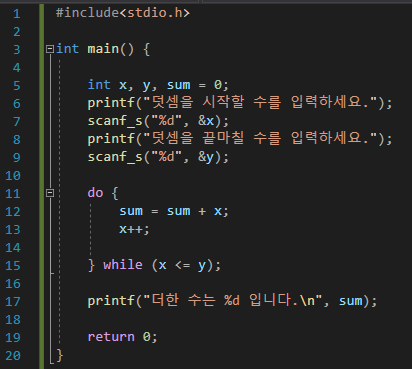 먼저 do while문을 사용하여 1부터 10까지 더하였을 때는 일반 while문을 사용하였을 때와 결과에 있어서 차이가 없습니다. while문을 사용했을 때도 동일한 결과가 나왔던 것을 우리는 알고 있습니다. 그런데 만약에 시작하는 수가 끝마칠 수보다 더 크다면 어떻게 될까요?