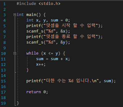 do while문에서는 일단 명령을 한번 실행하기 때문에 더한 수가 10이라는 문구가 출력되었습니다. 일반 while문은 어떤 결과값이 나올까요?