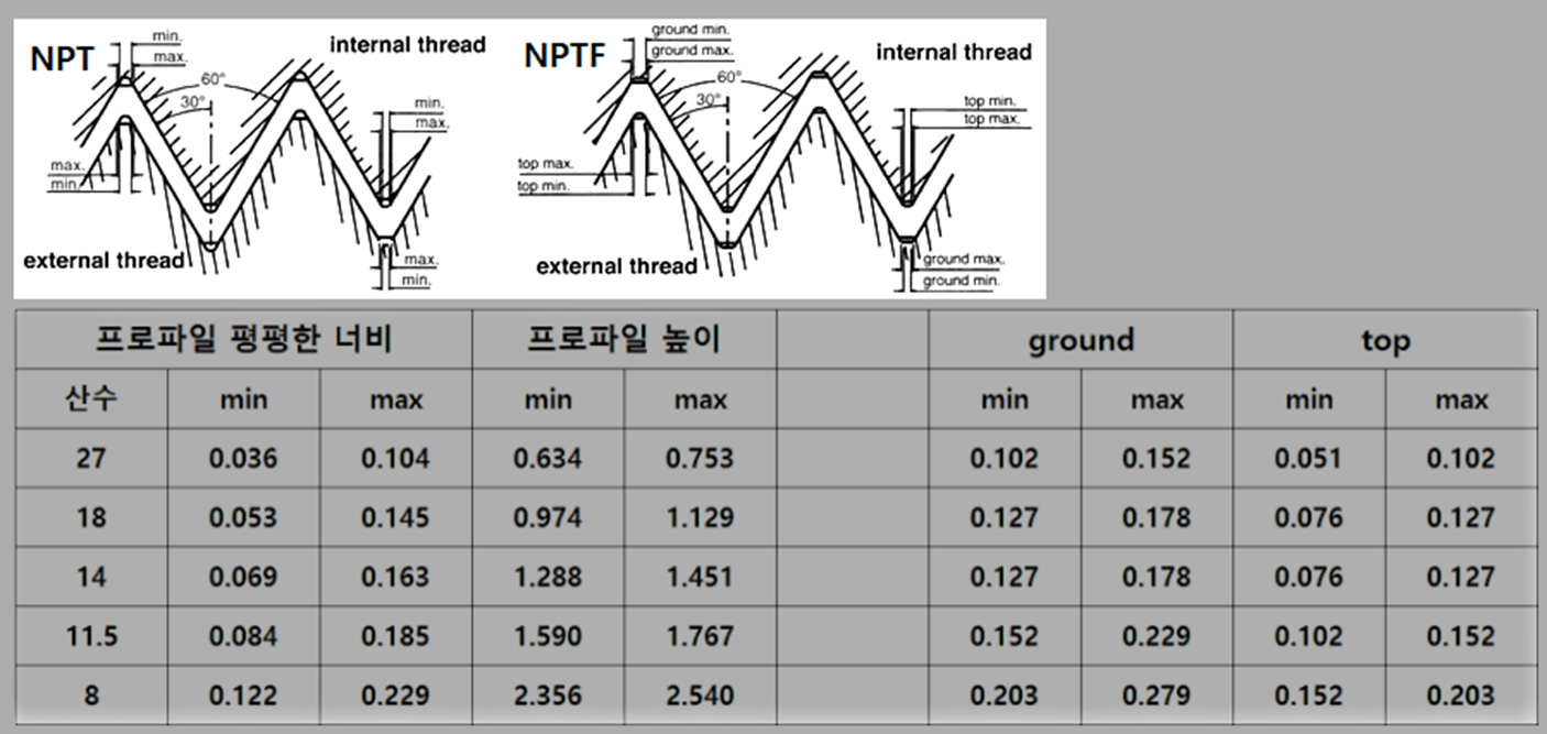자.. 앞서 두가지 PF와 PT규격은 영국식 기준을 따른 규격이었습니다. 지금부터 알아볼 NPT는 미국식 기준을 따르는 규격입니다. 정확한 명칭은 "National Pipe Tapered" 이며 ANSI/ASME B1.20.1의 규격을 따릅니다. 이 NPT계열에는 NPT외에도 NPTF, NPS, NPSF등이 있습니다. 위에서 알아봤던 영국식 규격의 PF와 PT처럼 평행나사와 테이퍼(경사)나사의 차이인데, NPT와 NPTF는 미국식 관용 테이퍼(경사) 나사이고, NPS와 NPSF는 미국식 관용 평행 나사입니다. 영국식 규격과 미국식 규격의 가장 큰 차이점이라고 한다면 나사산의 각도를 들 수 있습니다. 영국식은 55도인 반면, 미국식은 60도 입니다. 그리고 나사산의 갯수도 차이가 납니다.