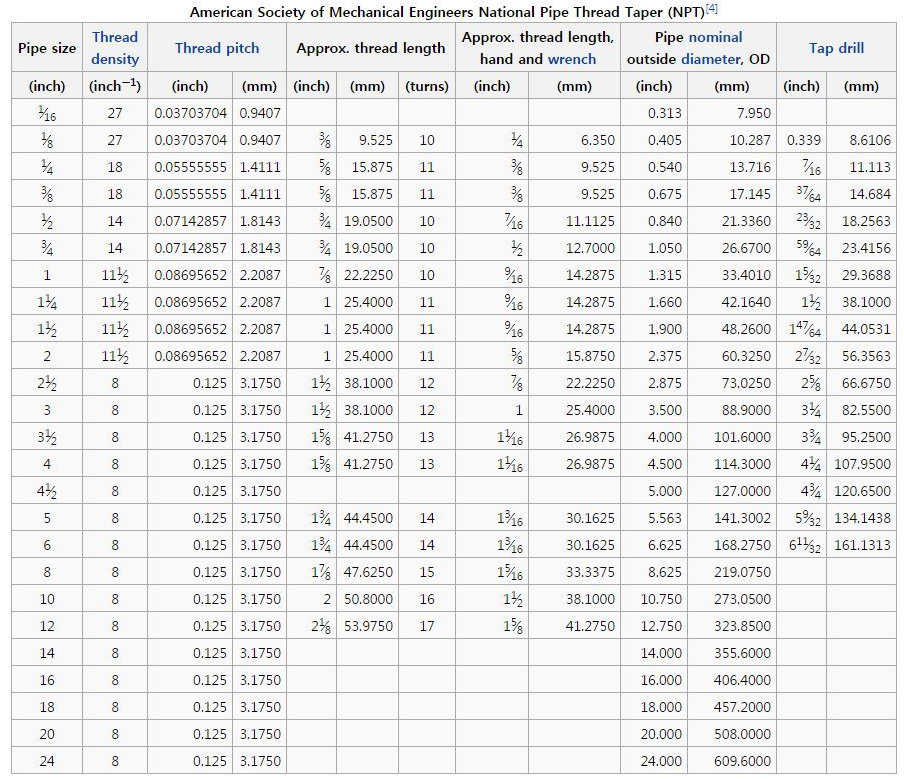 위 표는 NPT 규격표 입니다. 참고하시기 바랍니다. 관용 나사 규격의 정보가 좀 정확하게 정리된게 없어서 제가 궁금한 내용 기준으로 쭉 찾아서 정리해 보았습니다. 오늘은 여기까지 하겠습니다. 감사합니다.