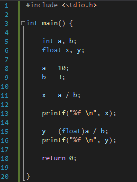 변수의 타입이 서로 다를 경우 연산이 실행되지 않거나 오류가 발생하는데 이럴때 형변환(캐스팅)을 통하여 변수의 타입을 통일시켜주어야 합니다. 예를 들어서 int형과 double형 혹은 float형은 대입이나 연산, 출력등이 정상적으로 수행되지 않습니다. 그래서 만약 double, float등 실수형을 정수형에 대입하고 싶다면 실수형 자료를 정수형으로 형변환(캐스팅) 한 뒤에 대입을 해야 합니다. 참고로 순수 연산은 자료형이 한쪽만 실수형이더라도 정수형이 자동으로 실수형으로 변환연산되기 때문에 연산이 작동하긴 합니다. 일단 간단한 예제를 통해 알아보도록 하겠습니다.