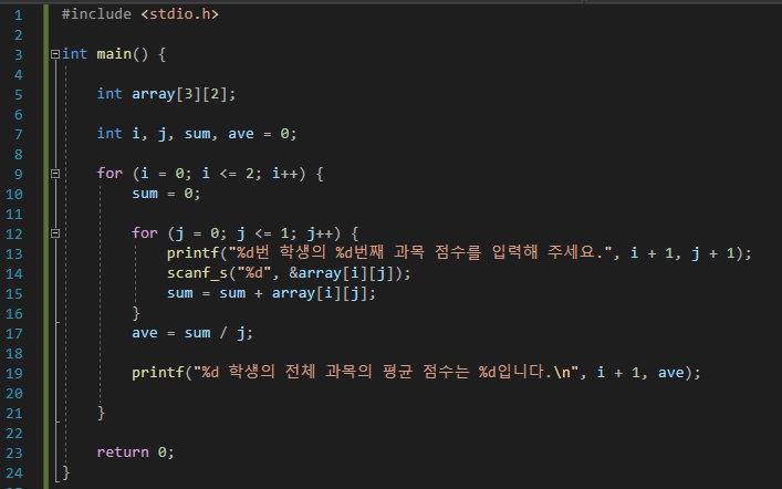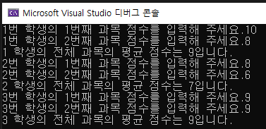 1차원 배열을 사용 했을 때 처럼 배열을 호출할 때 원소 갯수를 변수로 활용해 점수를 입력하고 점수의 평균을 구하는 프로그램 입니다. 1차원 배열을 확실히 배웠다면 해당 예제도 크게 어려울 것 없는 예제입니다. 항상 주의 할 것은 배열을 선언할 때 대괄호 안에 입력한 숫자는 배열의 원소 갯수이지 원소번호가 아니라는 점을 꼭 기억해야 합니다. 그럼 프로그램을 실행해 보겠습니다.