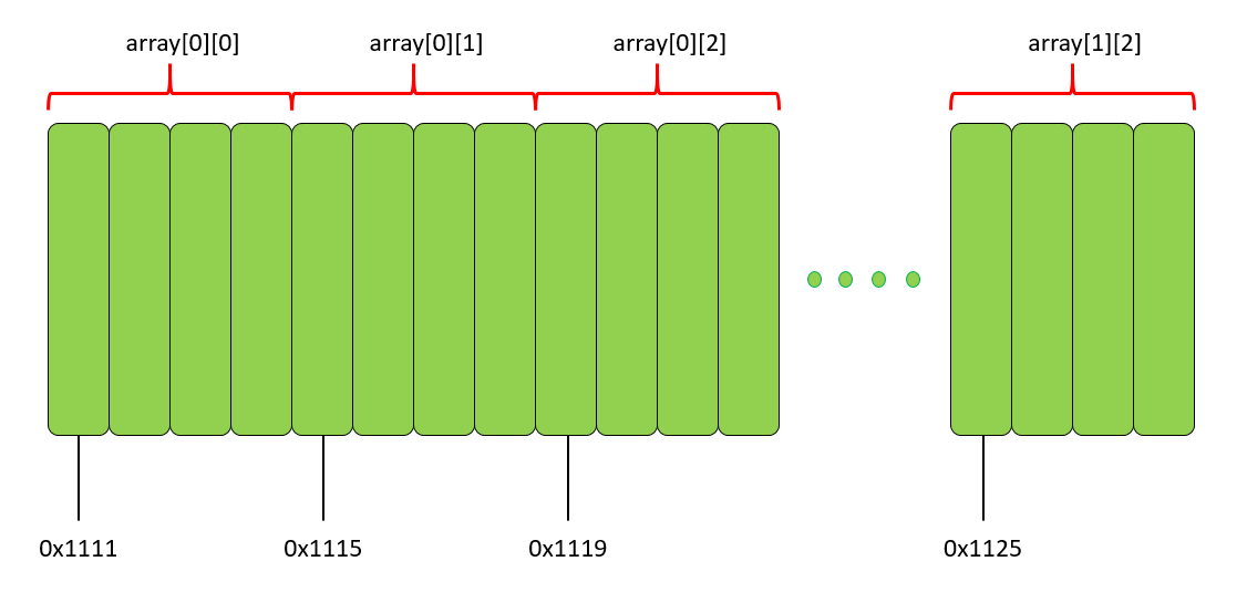 순서는 [0][0], [0][1], [0][2], [1][0], [1][1], [1][2]입니다. 그럼 메모리 공간에서는 어떻게 존재할까요?