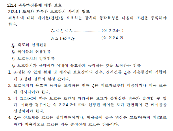 위 그림까지가 212.4.1문항으로 차단기의 정격 설계 조건에 대한 내용이고 212.4.2문항부터는 과부하 보호장치의 설치 위치에 대한 내용으로 해당 내용은 다른 포스팅에서 알아보도록 하겠습니다. 그럼 위 212.4.1문항에 의거하여 차단기 정격용량 선정 방식을 하나씩 차근차근 알아보도록 하겠습니다.