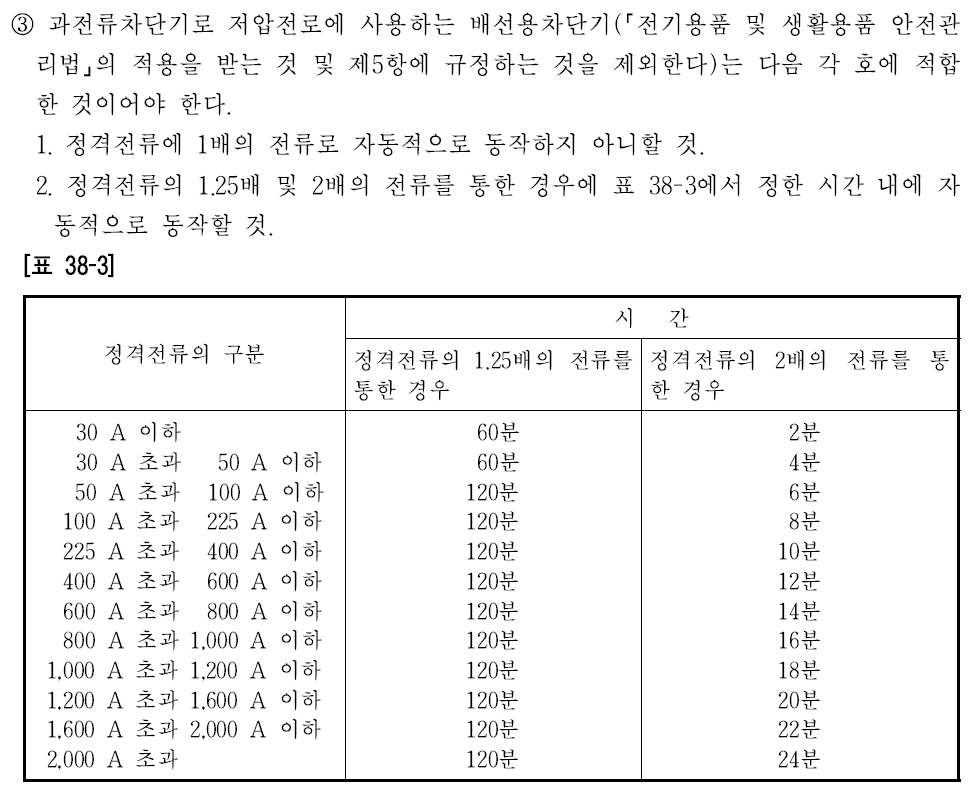 또한 정격전류가 50A 이하인 일반부하의 경우에는 부하전류의 1배에서 차단기가 동작하지 않아야 하므로 차단기의 정격은 해당일반부하의 정격전류 이상인 것을 사용해야 하며, 차단기는 정격전류의 1.25배에서 60분 이내에 차단동작을 해야하며, 2배에서는 2분에서 4분사이(표38-3 참조)에서 차단동작을 해야합니다.
