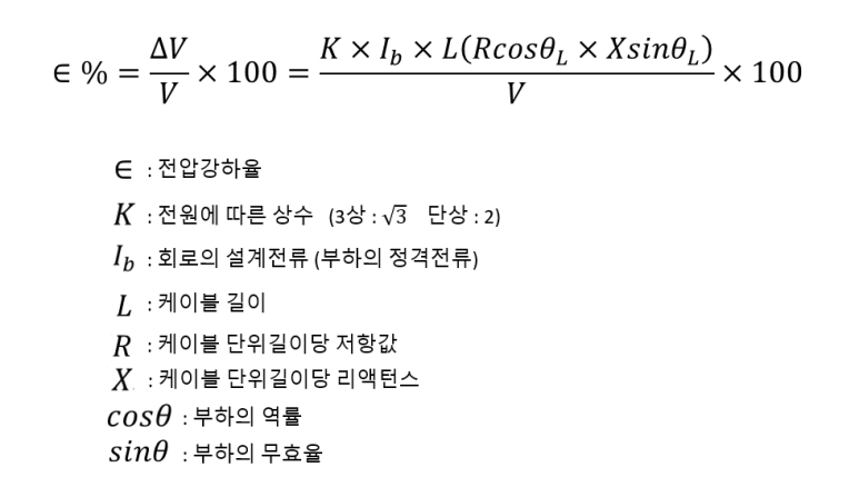 위 상황으로 봤을 때 저압 말단 부하 기준으로 전등부하는 3%, 다른 일반부하 및 전동부하의 경우에는 5%까지 허용이 되는 것을 알 수 있습니다. 그럼 이건 어떻게 계산해야 할까요? 다들 전기기사 공부할 때 많이 봤을 겁니다. 바로 아래의 전압강하 식을 사용하면 됩니다.
