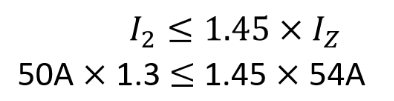I2는 차단기의 정격전류에 위 표에서 나와 있는 차단기의 동작 전류 배수를 곱해서 구하며, 그 크기보다 케이블의 허용전류에 1.45배 한 값이 더 크거나 같아야 한다는 의미입니다. 그럼 차단기의 정격전류가 50A이고 산업용 배선차단기라고 가정하며, 케이블의 허용전류가 54A이므로 아래와 같이 계산됩니다.