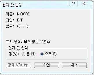 M0를 다시 더블클릭 해보면 아래 '현재 값 변경' 페이지가 생성되고, 현재 값 입력에서 오프(F)를 선택 한 뒤