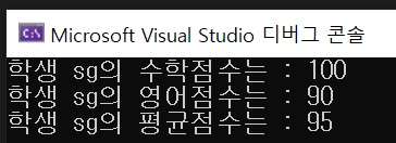 이렇게 하면 이제 main함수에서 sg라는 이름을 가지는 student타입의 구조체를 사용할 수 있게 되는 것입니다. main함수의 다른 부분은 어려운내용이 없으니 따로 설명하진 않겠습니다. 그럼 바로 실행하여 보겠습니다.