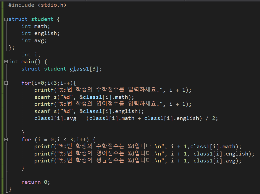 위 부분이 구조체를 선언하는 부분입니다. struct는 구조체를 의미하고, student는 구조체의 타입명이라고 생각하시면 됩니다. 구조체는 우리가 여러가지 데이터타입을 조합하여 만들기 때문에 그렇게 조합된 구조체 타입을 명명할 수 있어야겠죠? 그 타입명이라고 생각하시면 됩니다. 그리고 math, english, avg를 int(정수)타입의 원소로 선언하였습니다. 물론 int(정수)타입이 아닌 다른 데이터 타입도 추가할 수 있습니다. 구조체를 선언한 후 main함수에서 구조체를 사용하려면 사용자가 원하는 구조체를 따로 다시 선언해 주어야 합니다. 그 부분이 바로 아래 부분입니다.