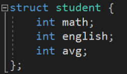 구조체는 위와 같은 형태로 선언하며, 여러가지 데이터 타입을 가지는 멤버를 여러개 가질 수 있고, 이러한 조합을 구조체타입명을 지정하는 형태로 정의 하는 것입니다. 즉, 위에서 struct는 구조체를 의미하고, student는 int(정수)타입의 멤버 3가지를 가지는 구조체 타입명을 의미하며, math, english, avg는 각각의 멤버가 됩니다.