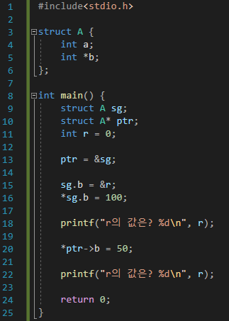구조체를 두번 호출 했는데 한번은 그냥 일반적인 구조체이름 sg를 사용하였고, 또 한번은 포인터형식인 *ptr을 사용하였습니다. 이렇게 함으로써 구조체 struct A *ptr은 구조체 포인터가 되었습니다. 구조체를 지목하는 포인터라는 의미지요. 그리고 나서 구조체 sg를 지목하게 하였습니다.
