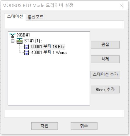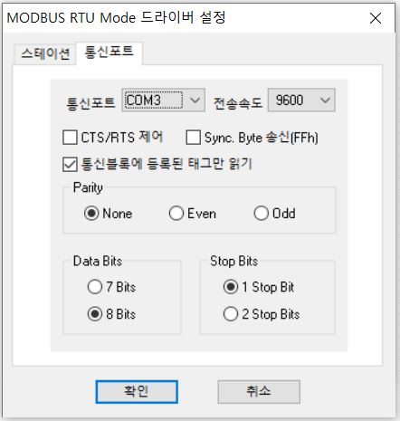 그리고 확인을 누르면 아래와 같은 MODBUS RTU MODE 드라이버 설정 창이 뜹니다.