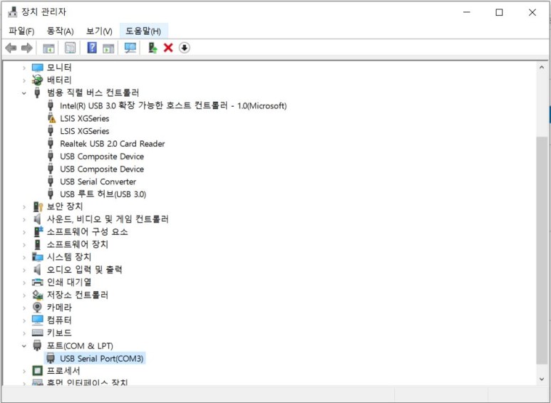 PC의 설정은 아래화면과 같이 [장치 관리자] 옵션에서 [포트] 항목을 통해 확인 할 수 있습니다.