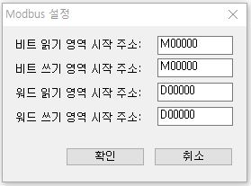 중요한것은 실제 I/O 어드레스는 모드버스 주소 (M0 -> 00001, D0 -> 40001)를 사용해야 한다는 점입니다.