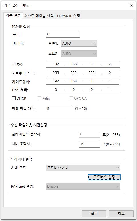 아래와 같은 [기본 설정 - FEnet] 페이지를 열도록 합니다.