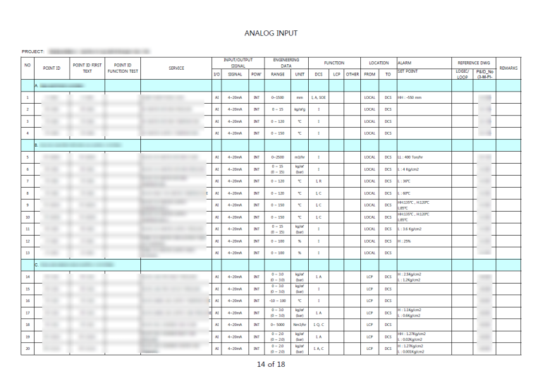 이 항목외에도 TAG 넘버는 필수로 들어가야 하고, P&ID나 LOGIC&LOOP도면넘버등은
