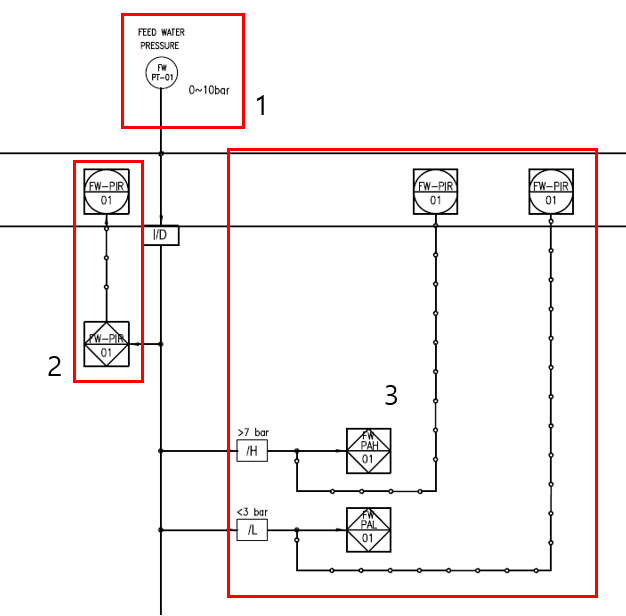 1번 네모박스 부분은 Field에 있는 Pressure transmitter을 표시한 것으로