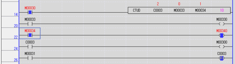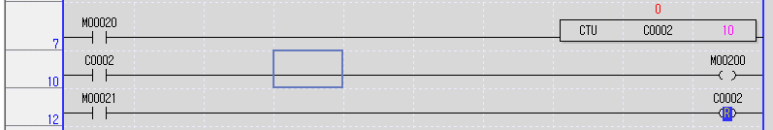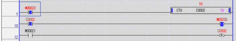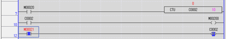 위 프로그램을 해석하자면 입력접점 M20이 On되면 업카운터 C2의 현재값이 1씩 늘어나고
