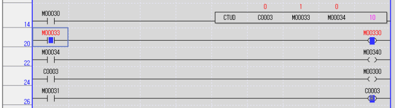 위 프로그램은 M33이 On될때마다 Up-Down카운터의 현재값이 증가하고