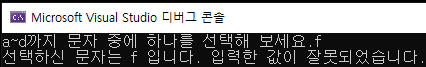switch문 마지막에 default를 붙였습니다. 선택한 문자를 출력하고 입력한 값이 잘못되었다는 문구를 출력하도록 하였습니다. 이번에 다시 f를 입력해 보겠습니다.