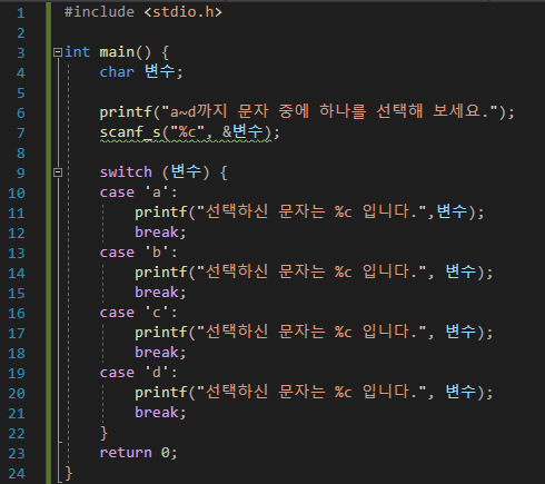 제일제일 기본적인 switch문 예제라고 할 수 있겠네요. 아! 정수형 변수를 선언할 때 처음으로 한글로 "변수"를 입력했는데, 변수를 선언할 때는 한글도 사용이 가능한것 알고 계시죠? 그리고 해당 변수의 값을 입력받는 프로그램을 6번과 7번라인에 printf함수와 scanf_s함수를 사용하여 작성한 뒤에 switch문을 사용하였습니다.